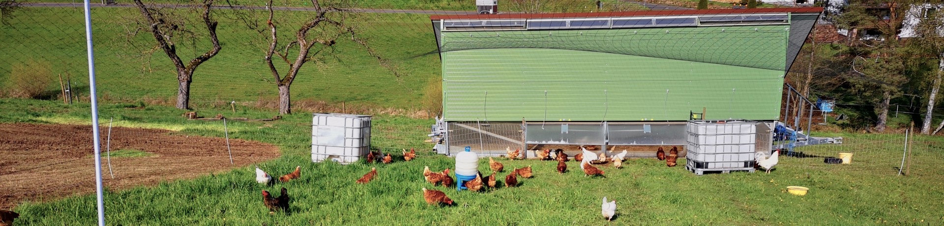 Das Hühnermobil ist ein fahrbares Heim für die Hühner. Regelmäßig werden die Hühner in ihrem Mobil auf eine neue Grünfläche bewegt, sodass ihnen immer frisches Gras zur Verfügung steht und die Wiese sich wieder regenerieren kann. So profitiert die Natur von gesundem Dünger dank Huhn, und das Huhn hat immer frisches Grün zum Wühlen.